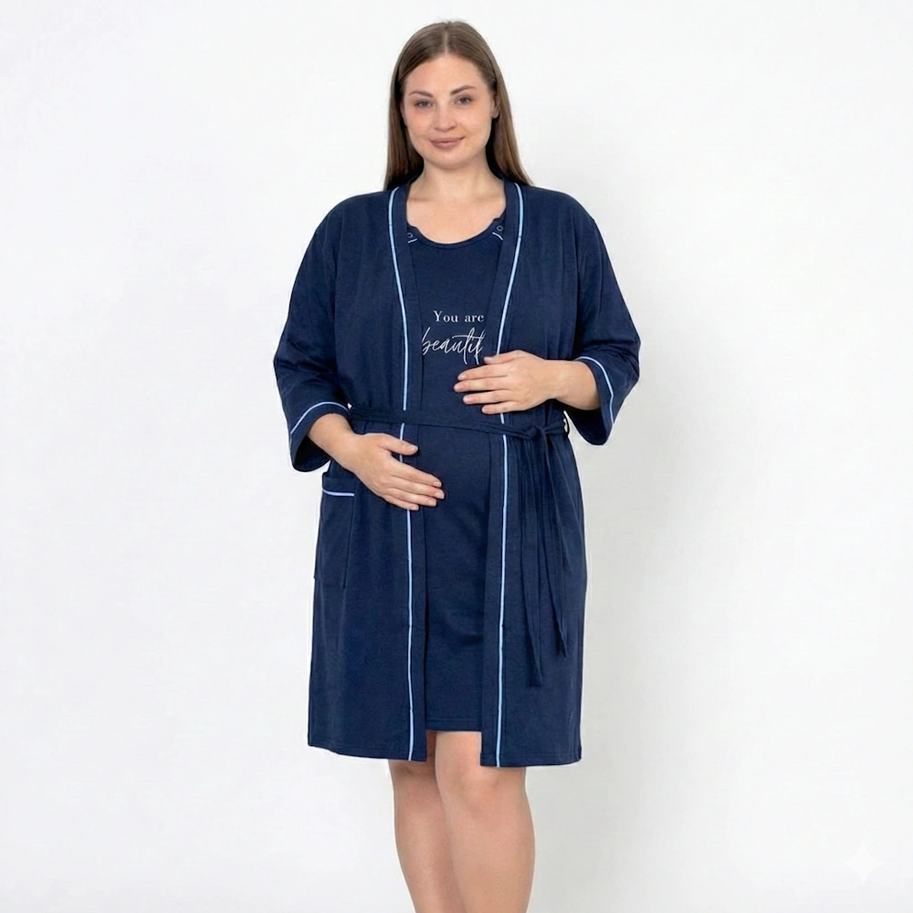 Poczuj się pięknie i komfortowo nawet na sali porodowej. Nasz granatowy komplet ciążowy to szlafrok i koszula do porodu, który został stworzony z myślą o mamach, które cenią sobie elegancję połączoną z maksymalną funkcjonalnością. To idealny zestaw prezentowy na Baby Shower lub baza wyprawki do szpitala.