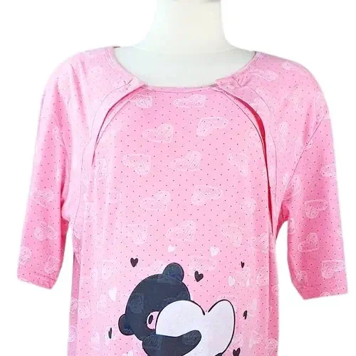 Bawełniana koszula ciążowa duże rozmiary dla kobiet karmiących piersią w różowym kolorze z uroczym wzorem w jasne serduszka. Wykonana w 100% z bawełny. Bardzo wygodna i funkcjonalna koszula ciążowa plus size z krótkim rękawem – idealnie sprawdzi się u kobiet o pełniejszych kształtach. Koszula nocna plus size o klasycznym kroju – prosta i wygodna, z dużym okrągłym dekoltem odpinanym z obu stron. Odpinany z dwóch stron panel ułatwi i przyspieszy nocne karmienie Twojego dziecka. Koszula ciążowa duże rozmiary posiada krój dopasowany do rosnącego brzucha, dzięki czemu nie krępuje ruchów i jest bardzo wygodna. To idealna koszula nocna bawełniana na okres ciąży. Koszula do karmienia rozpinana w uroczym, różowym kolorze z wzorem w serca ma długość przed kolano. Bardzo kobieca, wygodna i funkcjonalna.
