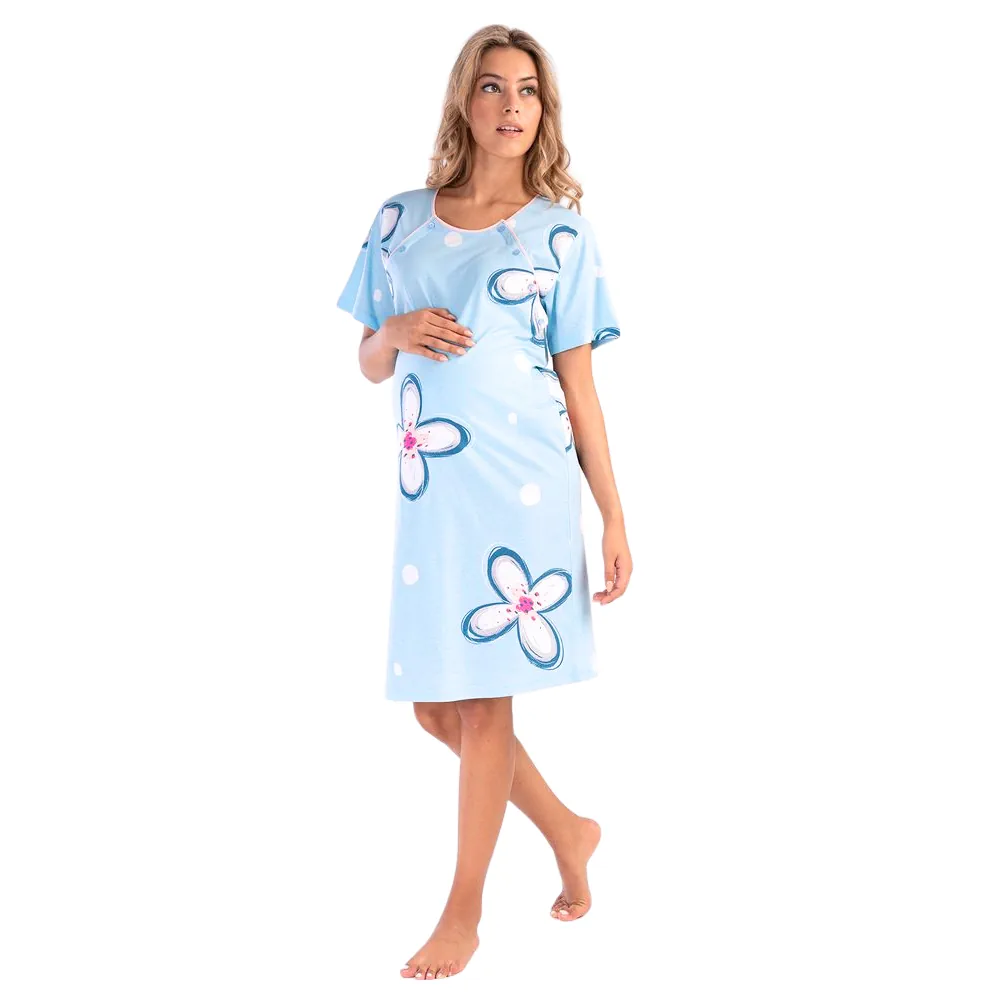 Koszula do karmienia bawełniana w niebieskie kwiaty to koszula do karmienia wykonana z miękkiej i przyjaznej dla skóry bawełny. Dzięki guzikom po obu stronach piersi ułatwia karmienie piersią. Niebieska koszula nocna dla karmiących posiada krótki rękaw, dzięki czemu będzie Ci wygodnie.