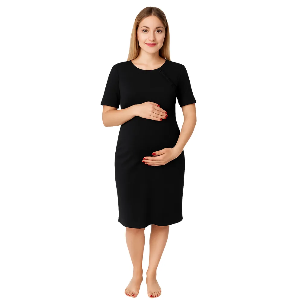 Głównym celem koszuli nocnej dla karmiących jest zapewnienie łatwego dostępu do piersi podczas karmienia. Proste i niezwykle wygodne rozwiązanie ułatwiające karmienie piersią. Czarna koszula nocna posiada możliwość dyskretnego karmienia noworodka, dzięki guzikom znajdującym się po obu stronach piersi. Masz pełną kontrolę nad tym, jak odkryć i przykryć piersi w zależności od potrzeb Twojego dziecka. Czarna koszula ciążowa, posiada krótki rękaw oraz klasyczny krój. Krój koszuli dopasowuje się do rosnącego ciążowego brzuszka. Czarna koszula ciążowa jest starannie wykonana z doskonałą precyzją.
