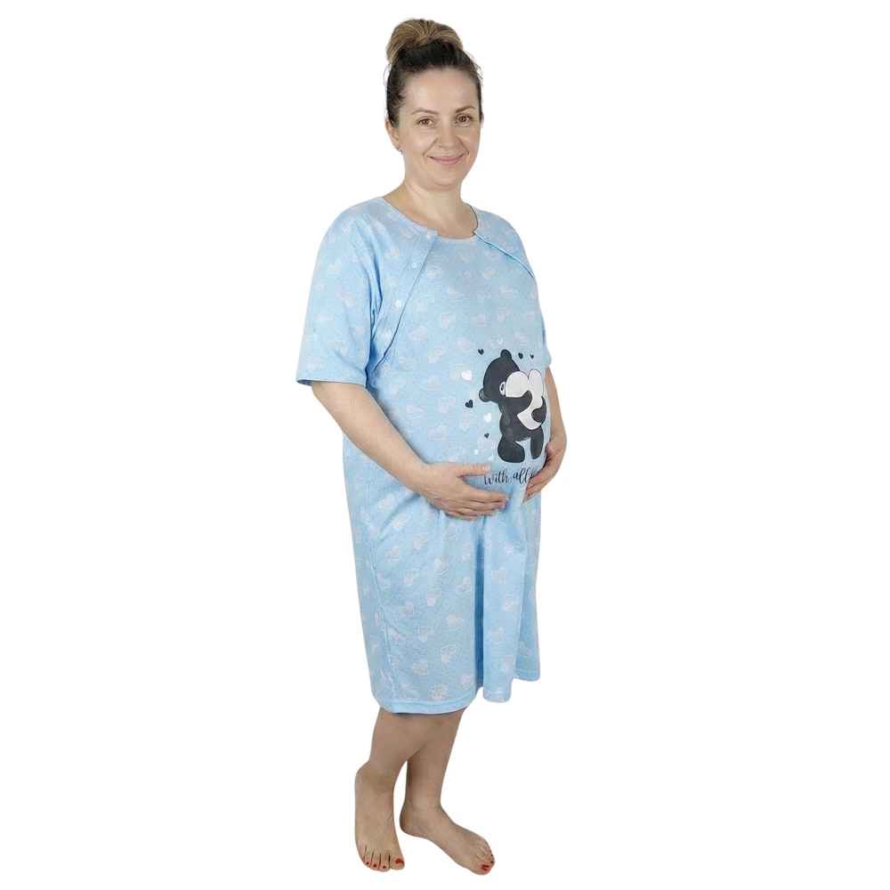 Bawełniana koszula nocna do karmienia duże rozmiary dla kobiet karmiących piersią w niebieskim kolorze z uroczym wzorem w jasne serduszka. Wykonana w 100% z bawełny. Bardzo wygodna i funkcjonalna koszula ciążowa plus size z krótkim rękawem – idealnie sprawdzi się u kobiet o pełniejszych kształtach. Koszula nocna plus size o klasycznym kroju – prosta i wygodna, z dużym okrągłym dekoltem odpinanym z obu stron. Odpinany z dwóch stron panel ułatwi i przyspieszy nocne karmienie Twojego dziecka. Koszula nocna do karmienia duże rozmiary posiada krój dopasowany do rosnącego brzucha, dzięki czemu nie krępuje ruchów i jest bardzo wygodna. To idealna koszula ciążowa plus size na okres ciąży. Koszula do karmienia rozpinana w uroczym, niebieskim kolorze z wzorem w serca ma długość przed kolano. Bardzo kobieca, wygodna i funkcjonalna.