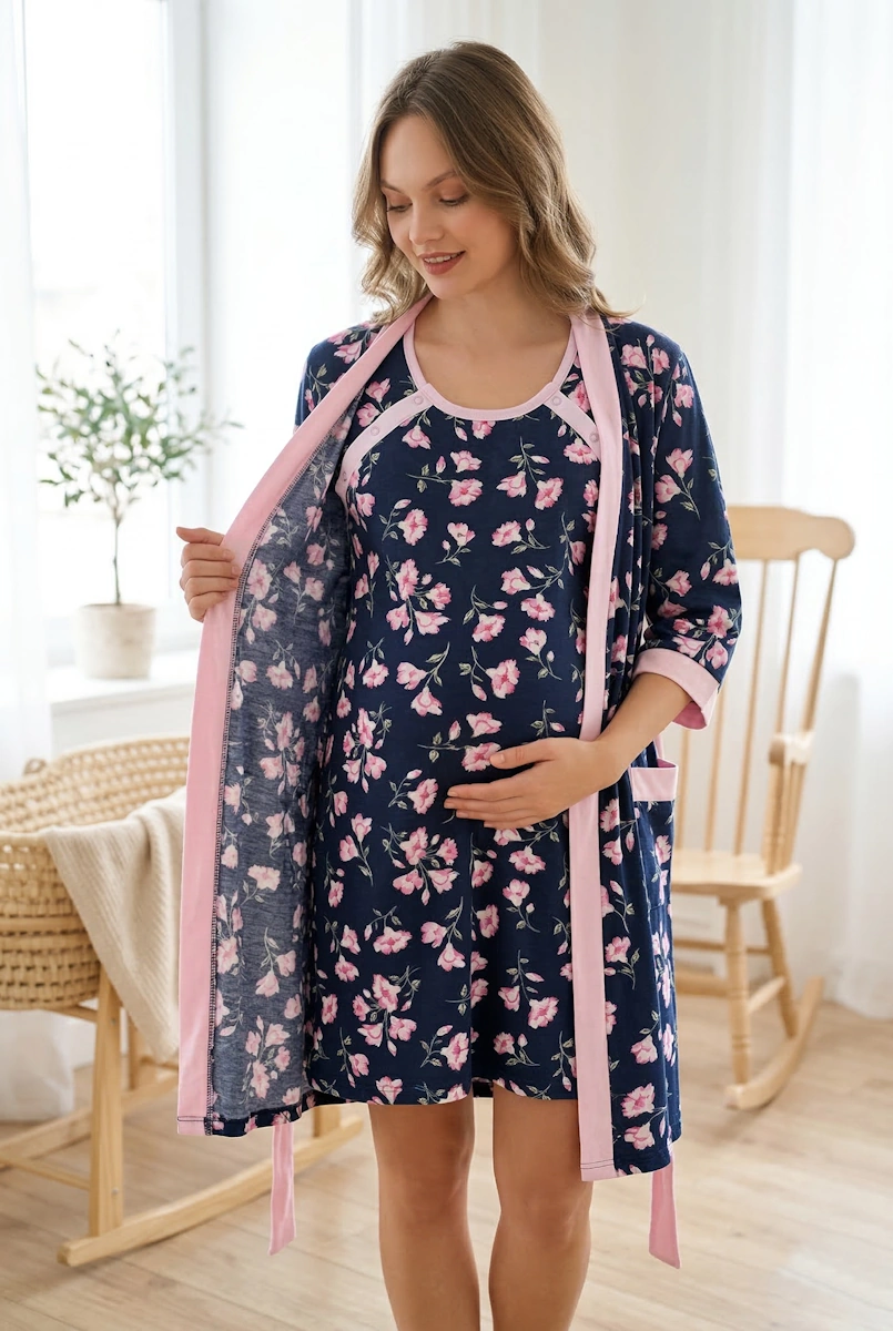 Szlafrok ciążowy idealnie się komponuje z koszulą ciążową do karmienia ozdobioną tym samym wzorem w kwiaty.