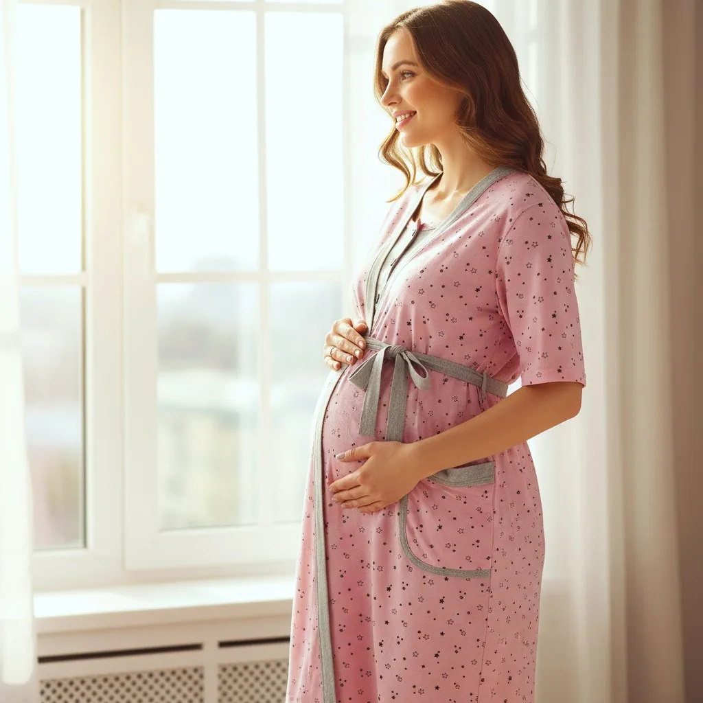 Bawełniany szlafrok ciążowy do koszuli nocnej w kolorze różowym.