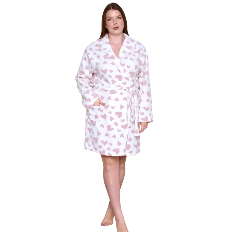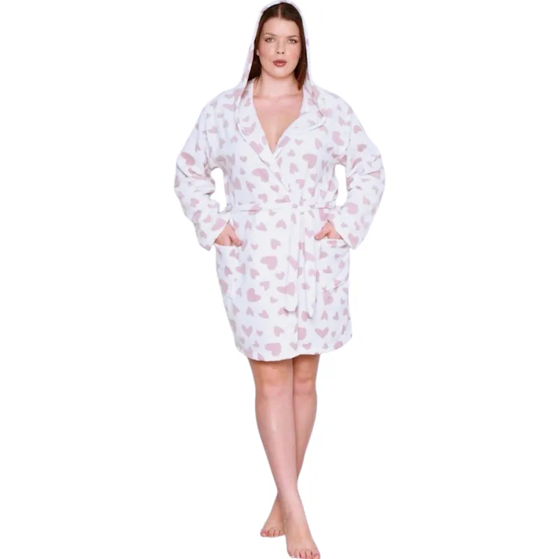 Ten ciepły miękki szlafrok plus size ciążowy ozdobiony jest wzorem serduszek. Szlafrok damski duże rozmiary jest idealny dla kobiet w ciąży lub karmiących piersią. Szlafrok ciążowy z kapturem wykonany jest z miękkiej tkaniny na bazie bawełny, co zapewnia komfort użytkowania w czasie chłodnych dni. Dodatkowo szlafrok plus size z łatwością dostosowuje się do zmieniającej się figury przyszłej mamy.
