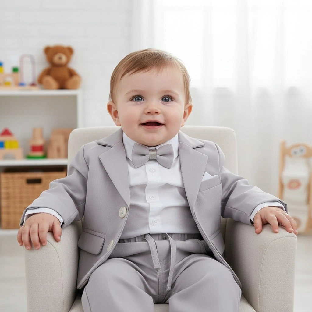 Elegancki komplet niemowlęcy – szary garnitur niemowlęcy do chrztu