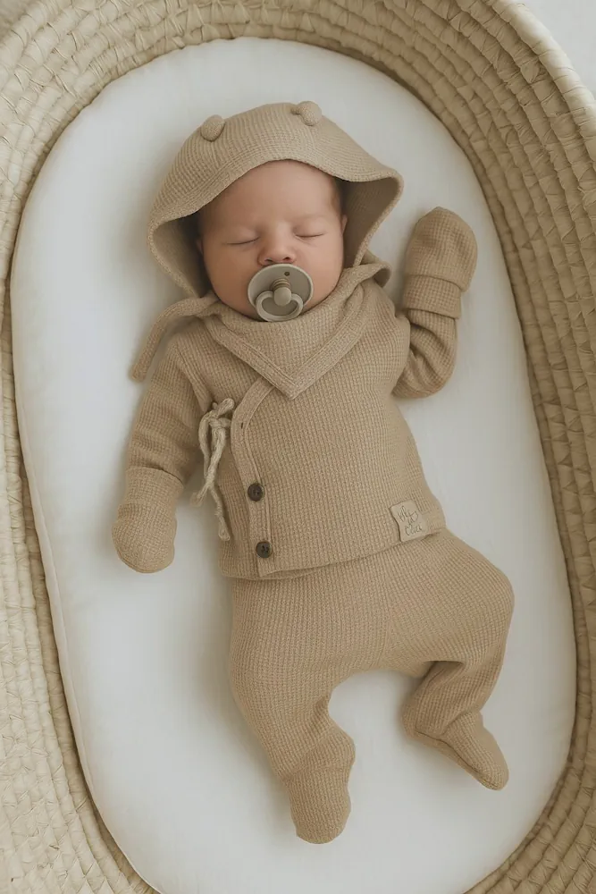 Ten zestaw ubranek dla noworodka to niezbędny element każdej wyprawki dla noworodka. Komplet ubrań dla noworodka w rozmiarze 56 doskonale się sprawdzi jako ubranka dla chłopców jak i ubranka dla dziewczynek. Beżowy kolor jest niezwykle modny i uniwersalny.