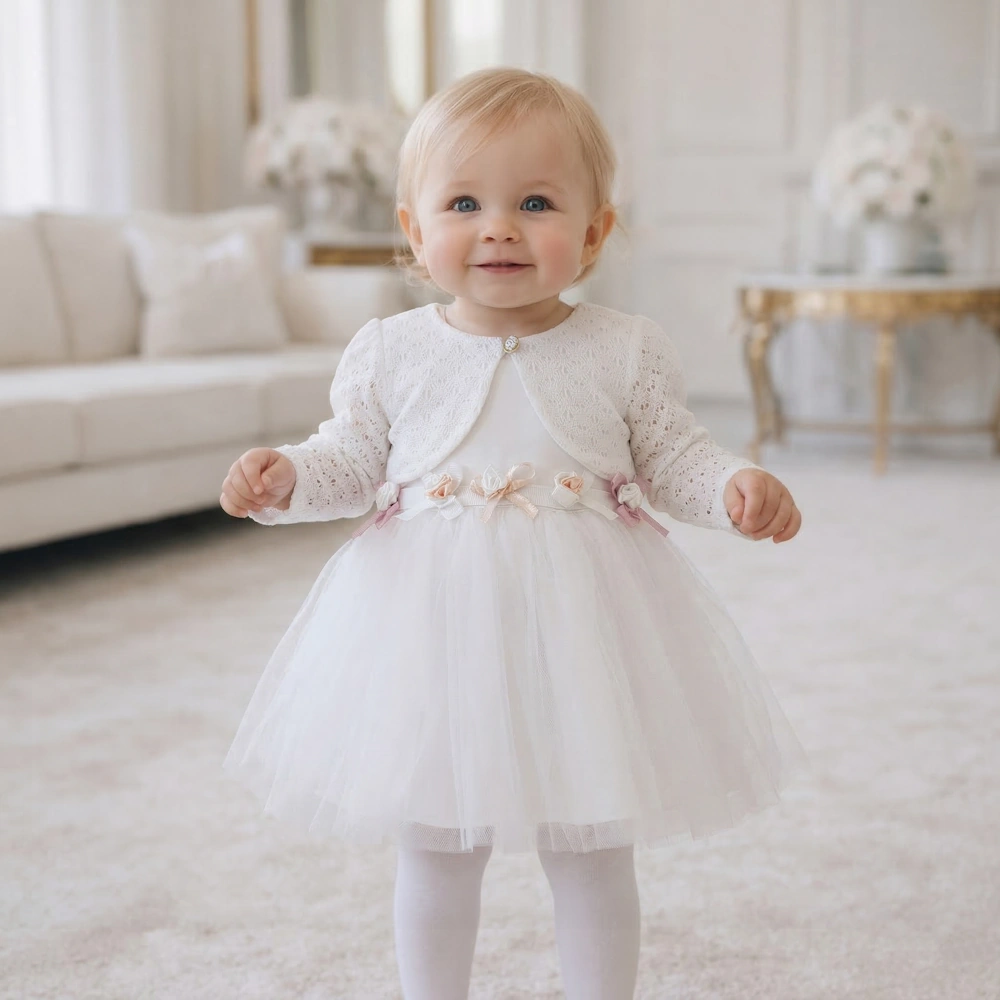 Sukienka doskonale sprawdzi się na uroczystość Chrztu świętego, dzięki długim rękawom Twoje dziecko będzie czuło się komfortowo nawet w chłodne dni. Miękka i lekka tkanina nie tylko zapewnia wygodę, ale także pozostaje przyjemna dla skóry przez całą ceremonię.